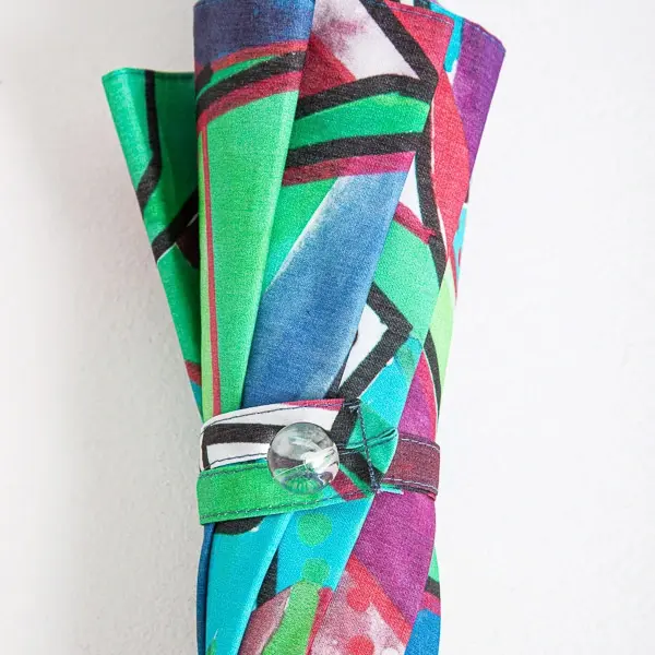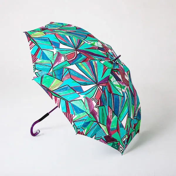 イタリア北部の繊維産地コモのテキスタイルメーカーSILKOMO社の生地を使用した晴雨兼用傘です。イタリアの自然や街並みを思わせるハリ感のあるジオメトリックプリントを、日本で丁寧に傘に仕上げました。持ち手には、軽くて透明感のあるクロアチア製のハンドルを使用。差すだけでモードなスタイルに。