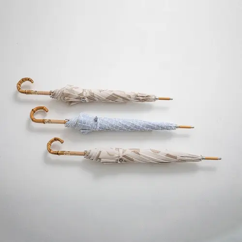菱模様のカットジャガード生地で作った晴雨兼用傘です。柄の周りをカットすることで細かなフリンジができる播州織カットジャガードならではの立体感が魅力。ベージュとオフホワイトのやさしい色合いと、甘くなりすぎない幾何学的な柄が、カジュアルスタイルにもクラシックな装いにもマッチします。